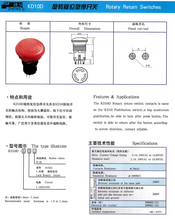 • KD10D旋轉(zhuǎn)急停復位開關 產(chǎn)品型號:KD10D